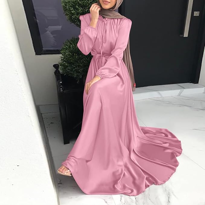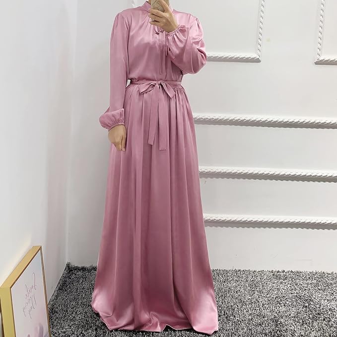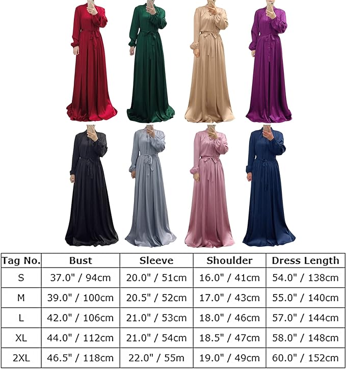- ★ Design: Elegent flowy mutilayer chiffon maxi dress with jilbab for muslim women. Casual Islamic kimono arabic dress, classic solid color design, simple yet chic. Muslim prayer long dress, smooth and glossy satin, elegant and stylish, great for Muslim women prayer wearing; Long bishop sleeves, modest and secretive, stand collar with straps which can be made into a bow, gives you a chic look.