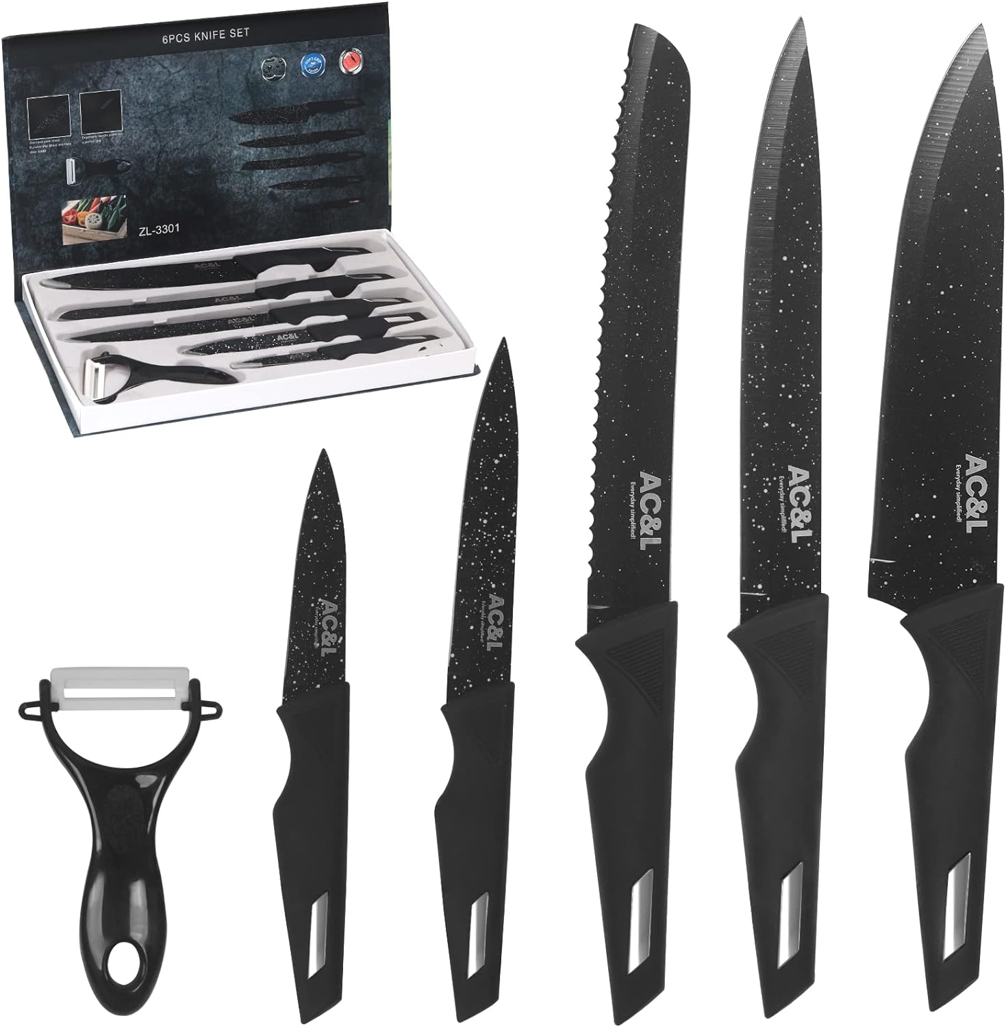 AC&L Kitchen Knife Set [6 Pcs Set] Stainless Steel Kitchen Knives with Peeler, Non-stick Ripple Pattern Sharp Blades with Safe and Sturdy Handles for Slicing, Chopping, Cutting (Black)