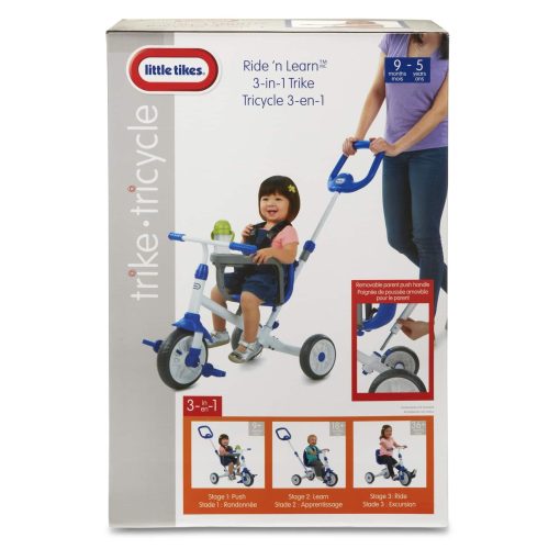 OverviewThis Ride ‘n Learn 3-in-1 Trike offers 3 stages that grow with your child. First the adult has full control while pushing and steering the trike. When the child is ready to learn they can begin to practice steering and pedaling while parents still guide the way. When they are ready, the child can now take full control and ride the trike all on their own! Installation required. No battery required. Three stages to grow with your baby: Stage 1-Push (9+ months) Parents have full control while pushing and steering the trike when child is too young to reach the pedals Stage 2-Learning (18+ months) Toddlers can begin to practice steering and pedaling while parents still guide the way Stage 3-Ride (36+ months) The child can take full control and ride the trike all on their own with parent supervision. Removable and adjustable waist bar and foot rest so your child can learn to pedal and steer with guidance. Fun, stylish and comfortable three stage starter trike to get your little one riding.