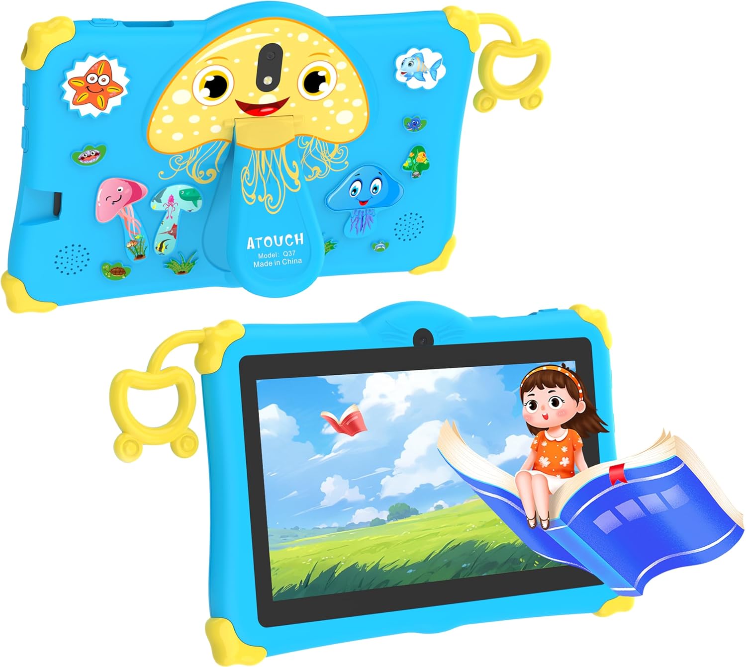 Atouch at your heart ATOUCH Android Tablet For Kids, 7-Inch Screen Q37 Early Education Smart Tablet Anti-drop Silicone Edge Wi-Fi, Bluetooth, Games with Built-in Stand (Blue)