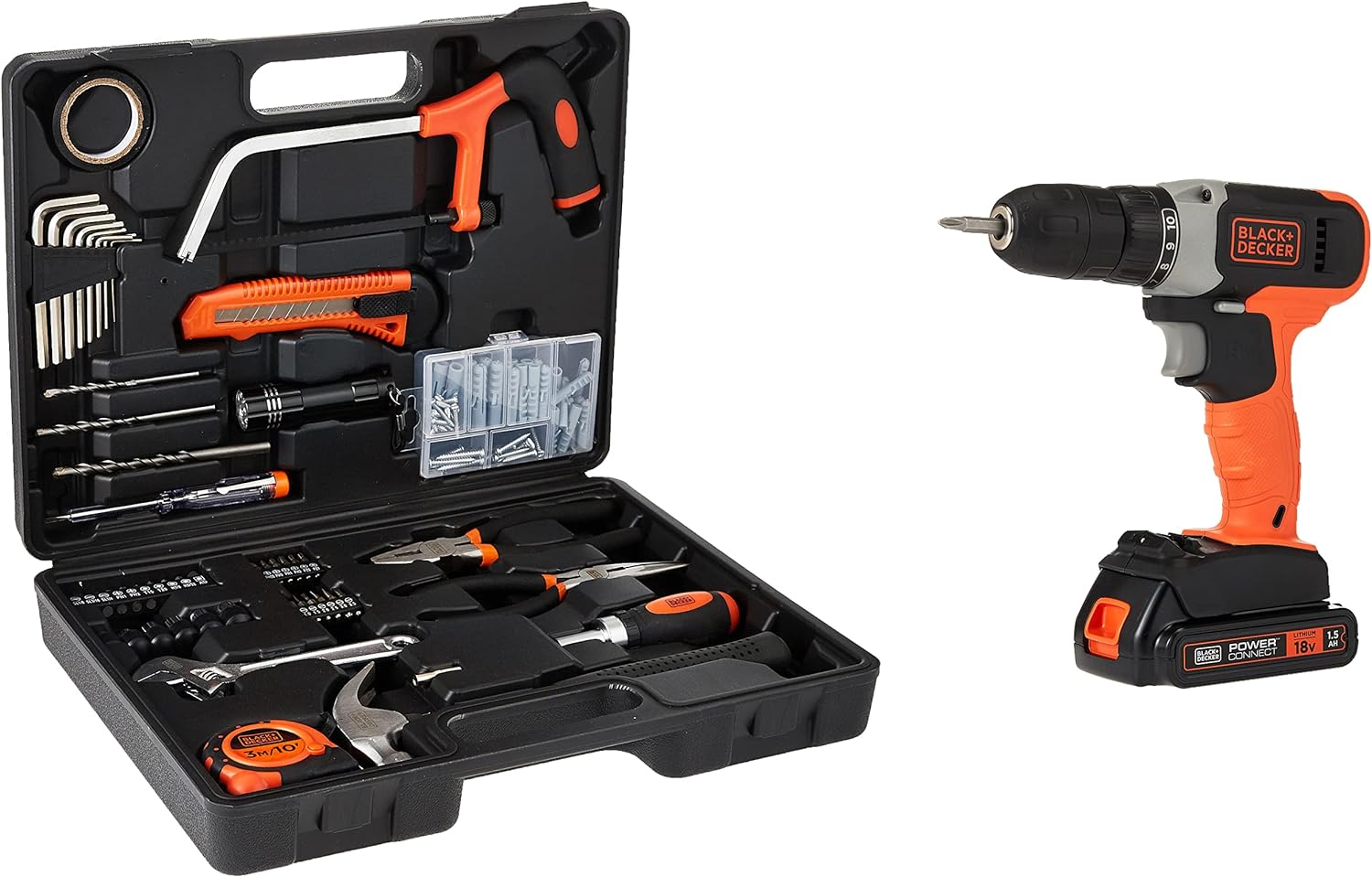 BLACK+DECKER cordless drill driver with battery & kitbox, 18v, 1.5ah li-ion + 108 pieces hand tools kit – bcd001c1mea2-gb