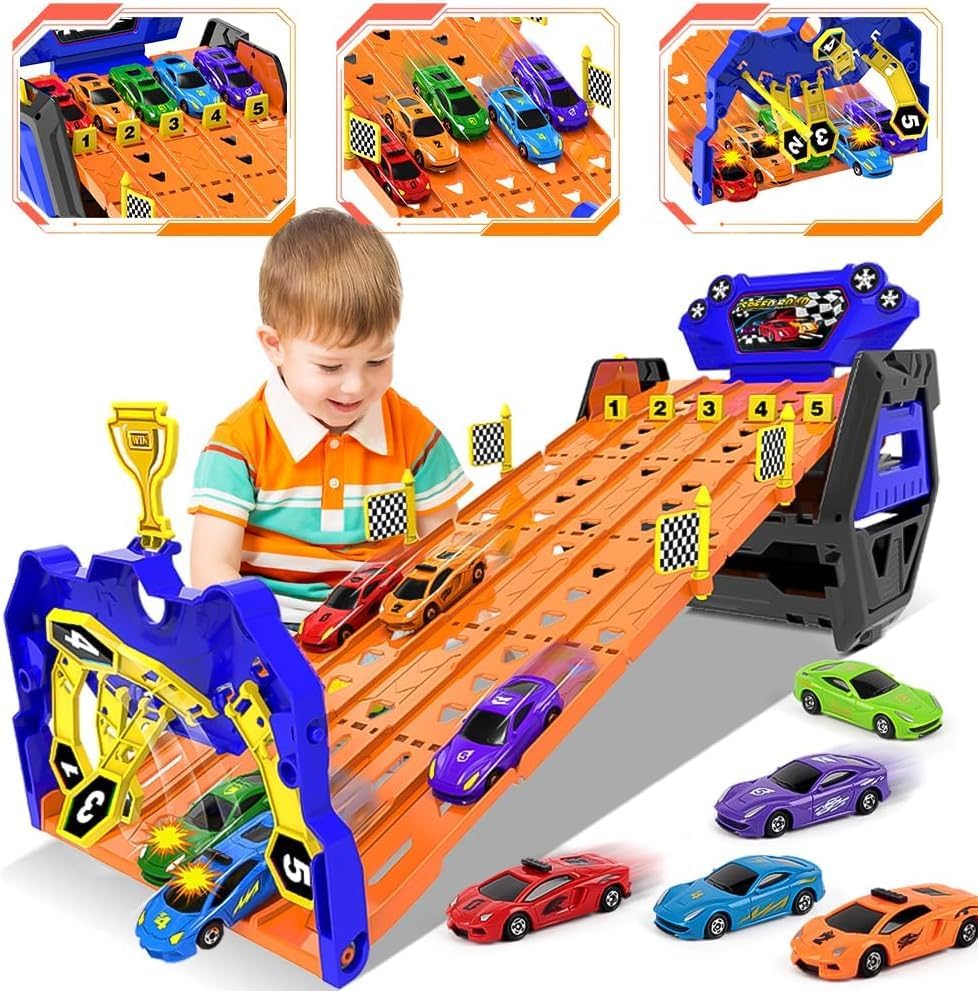 The toy car construction car kit has bright color matching different from other products, and stands out among a number of similar products. Easy to carry handle design, convenient to play anytime and anywhere. The hiddendrawer car organiser design is convenient for storage, which greatly saving storage space. The upgrade 5 track design is suitable for the duel between 5 racing cars at time, without the need to install batteries. The car can easily rush out of the track through the back-pull jet driving force, which is very suitable for children over 3 years old