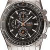- Stainless steel bracelet watch featuring black multi-function dial with three subdials