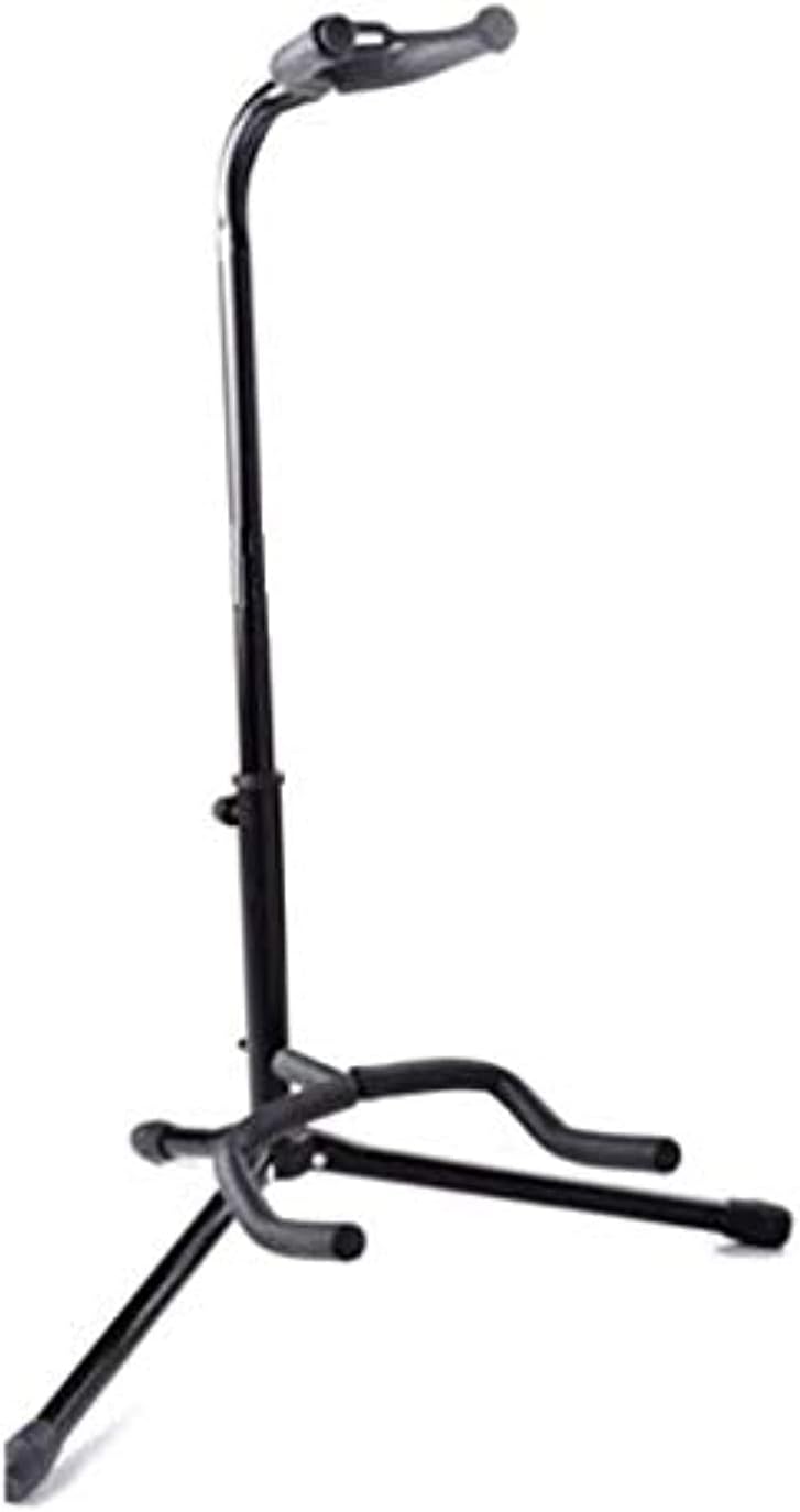 Adjustable guitar stand fits Classic, acoustic and bass guitars, Lightweight and durable steel tubing with soft rubber padding. Includes rubber security strap and non-slip rubber feet, Wide, secure tripod base folds down for easy storage.