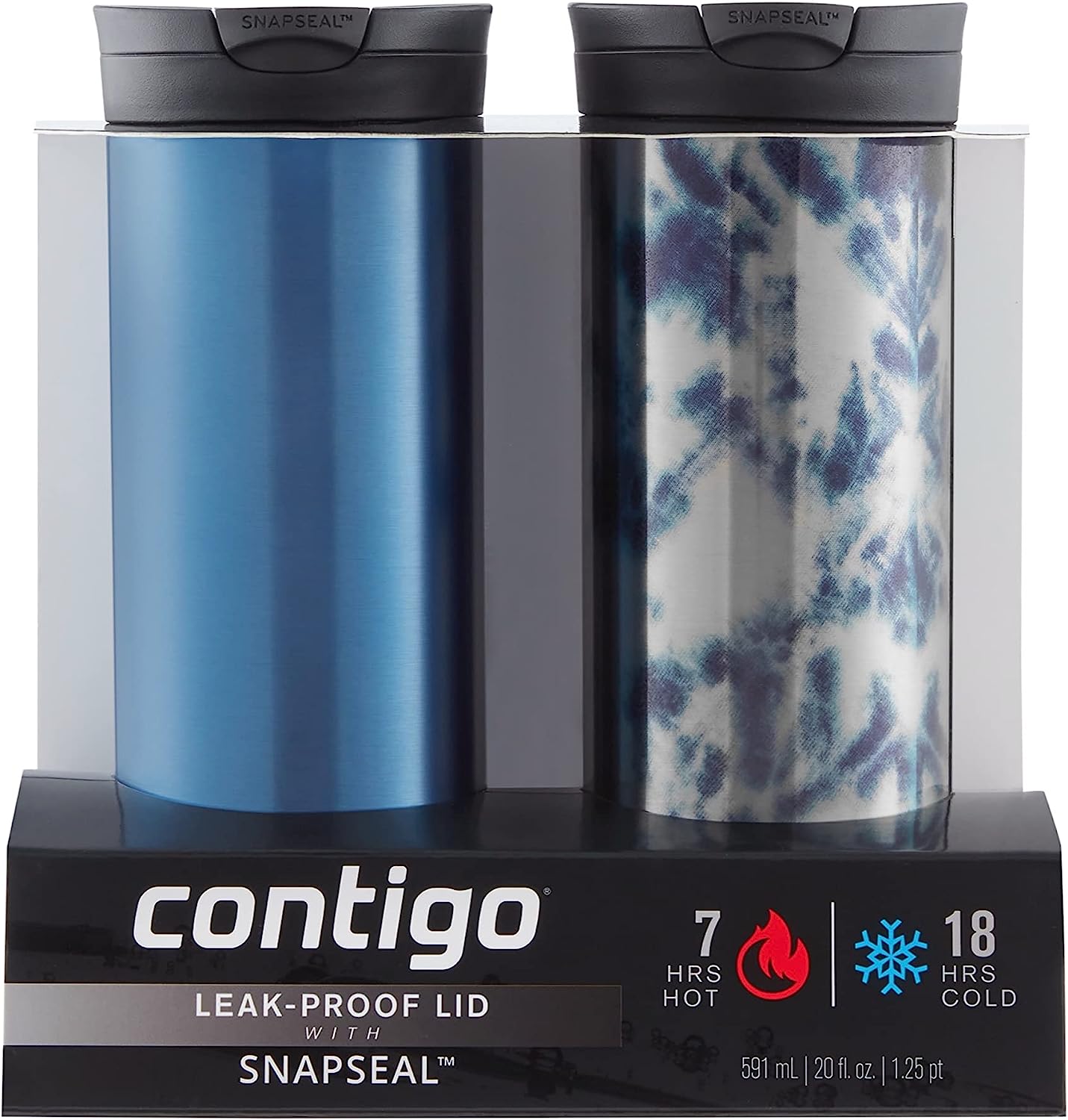 Contigo Huron Vacuum-Insulated Stainless Steel Travel Mug with Leak-Proof Lid, Keeps Drinks Hot or Cold for Hours, Fits Most Cup Holders and Brewers, 20oz 2-Pack, Blue Corn & Acid Wash