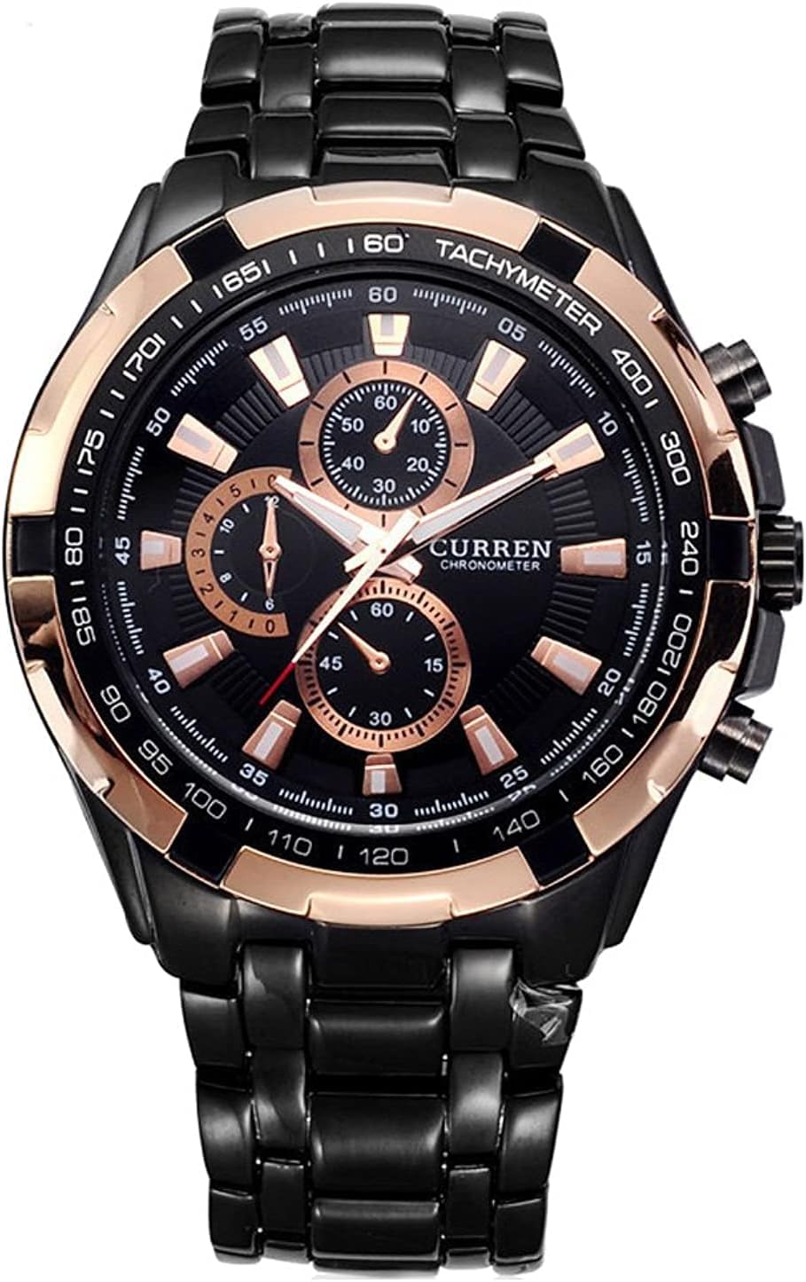 Case Size: 43mm Case Thickness: 10mm Band Width: 21mm Dial Colour: Black with Red Tone Numeral Band Colour: Black Bezel Function: Stationary Stainless Steel Case and Band Japanese Quartz Movement Minutes & Hour Marker Pull open deployment clasp Water Resistant Comes with a gift box.