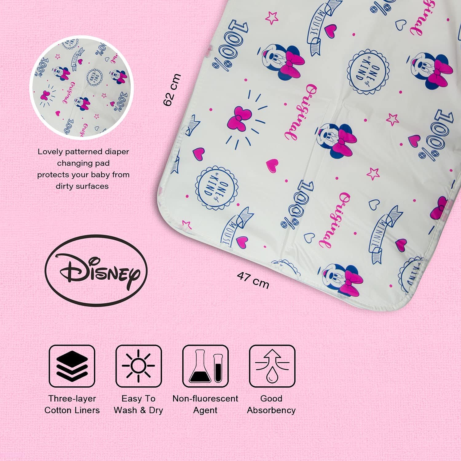 Disney Minnie Mouse 100% Waterproof Baby Diaper Changing Pad Toddler & Baby Reusable Waterproof Baby Diaper Changing Mat for Home or for Travel 47 x 64 cm, Soft & Secure & White, Multicolor