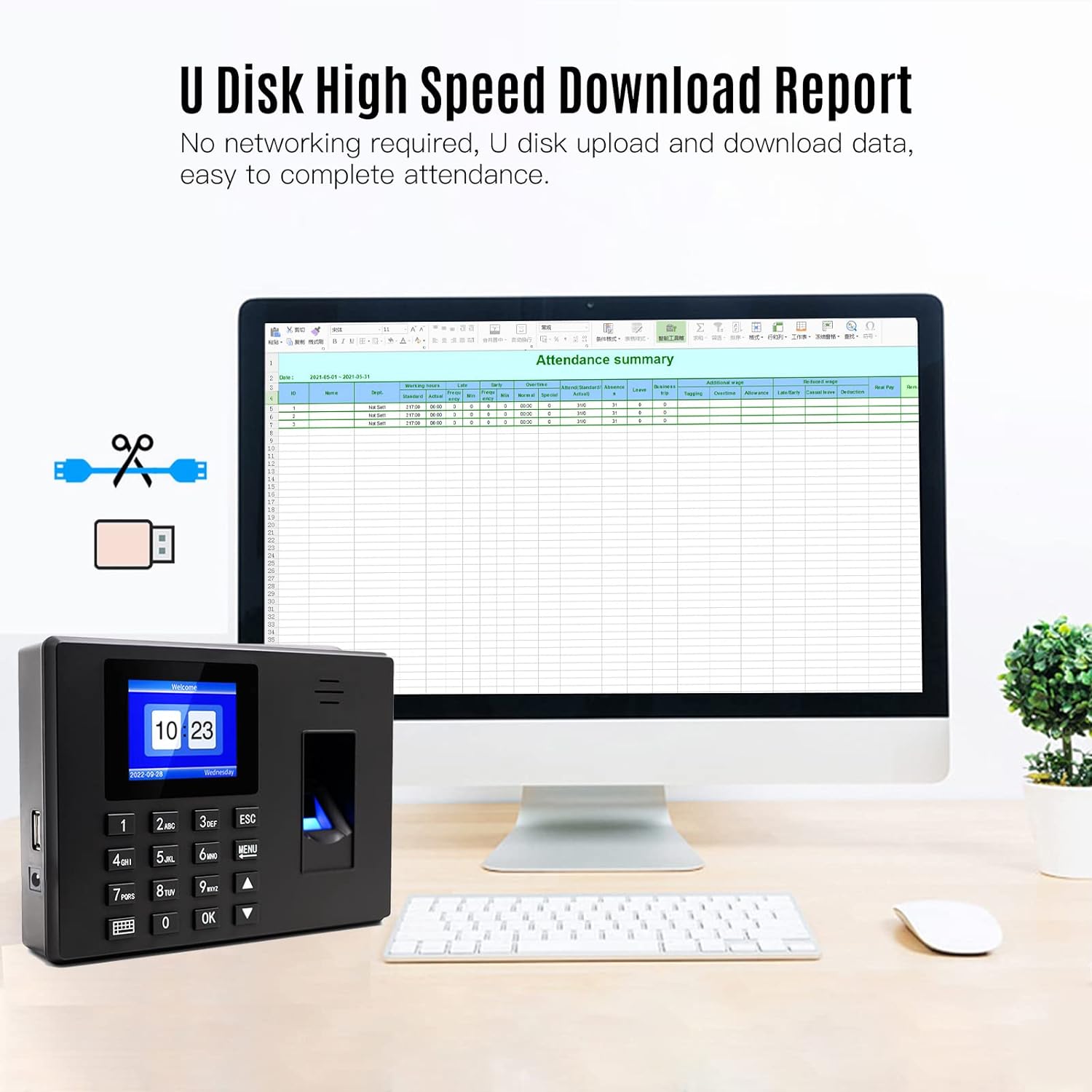 ✔ Easy to Operate: Support insert flash disk to download the export attendance report, punching record, record view, typesetting information. No need to reset the time recorder and never worry about data loss again when suddenly power off.