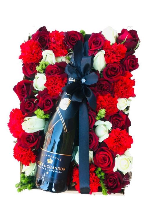 1 – 750ml Moet Champagne on a bed of roses wrapped in cellophane.
