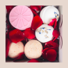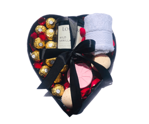 1 Scented candle, 12 Ferrero Rocher, 1 white face cloth, 3 bath bombs (option to brand towel for an additional $5) wrapped in cellophane.