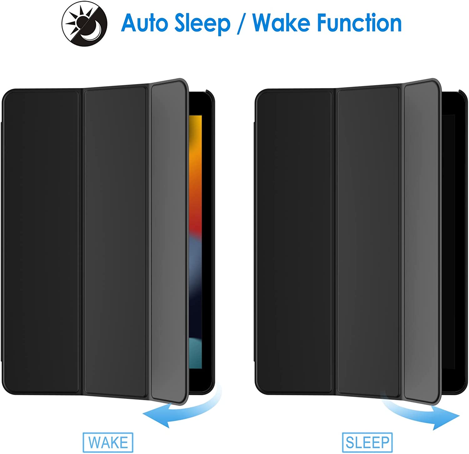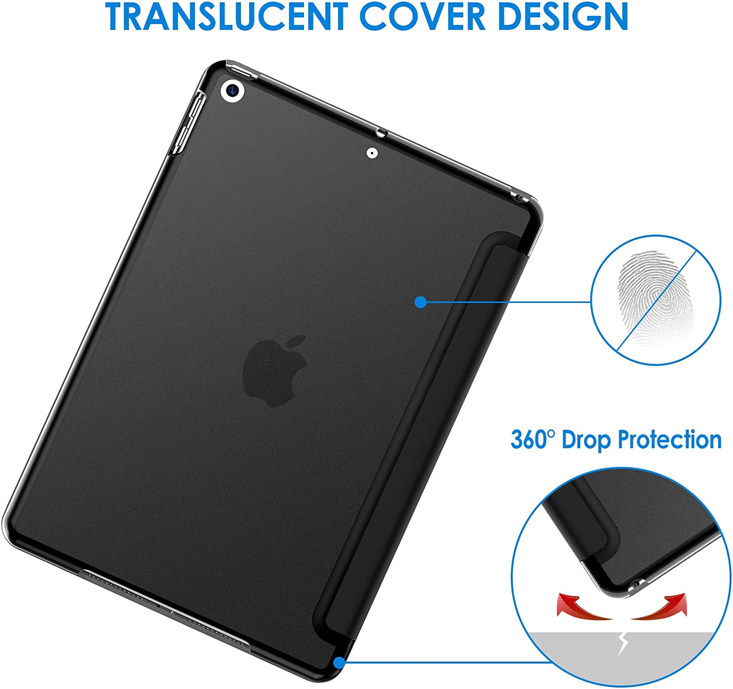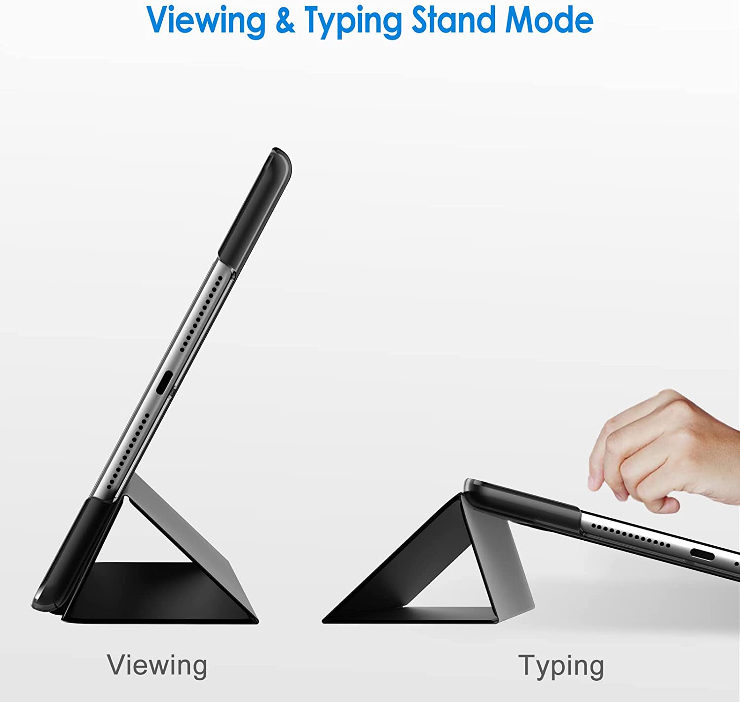 - Magnetic smart cover supports automatic sleep/wake function. The tri-fold front cover can support iPad in two standing position for viewing and typing