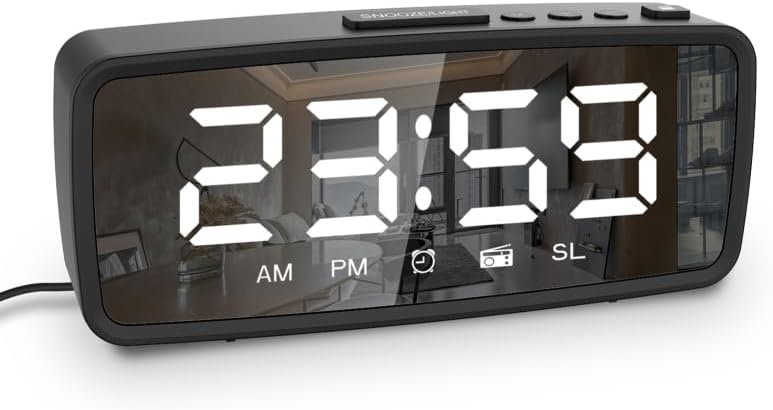 Labymos 5.1” Digital Alarm Clock Radio, Mirror Alarm Clock, 3 Levels Dimmer, FM Radio with Sleep Timer, Adjustable, Dark Mode, Alarm with Snooze, 12/24H Alarm Clocks for Bedroom Bedside Desk