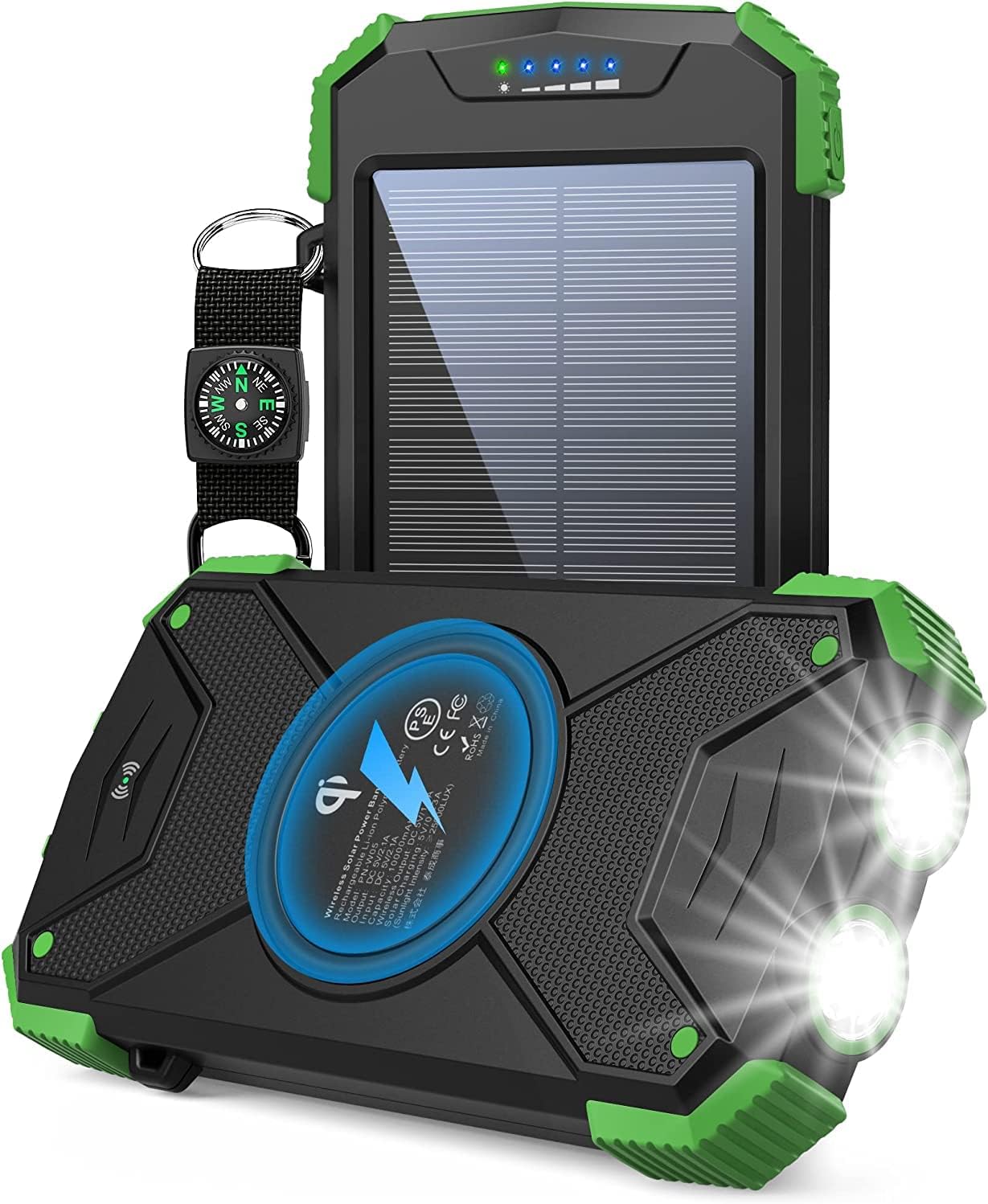 LEO WAY Solar Power Bank, Qi Wireless Portable Charger 10,000mAh, External Battery Pack with Type C Input/Output, Solar Panel with Dual LED Flashlight Compass Carabiner for Camping Adventure(Green)