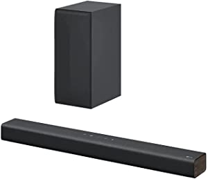 Transform your TV into a full home theater setup with this 2.1-channel sound bar and subwoofer. Made to pair with the latest LG TVs (Compatible with 2022 LG TVs and select 2021 LG TVs).TV Sound Mode ShareAI Sound Pro adjusts sound levels by content genre, ensuring that you can hear clear vocals, thunderous bass, and dynamic sound. Multiple connection options such as HDMI ARC and Bluetooth streaming from smart devices help you avoid cable clutter.