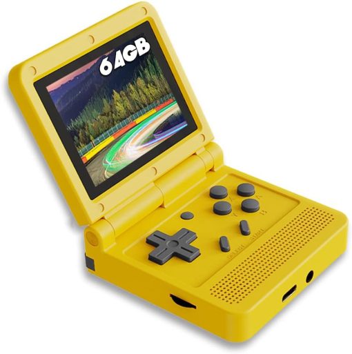 MAKINGTEC Flip Handheld Game Console with 3 inch IPS Screen Portable Mini Retro Game Console Open System 64GB TF Card Built-in Game Video Console Built-in Rechargeable Battery-Yellow