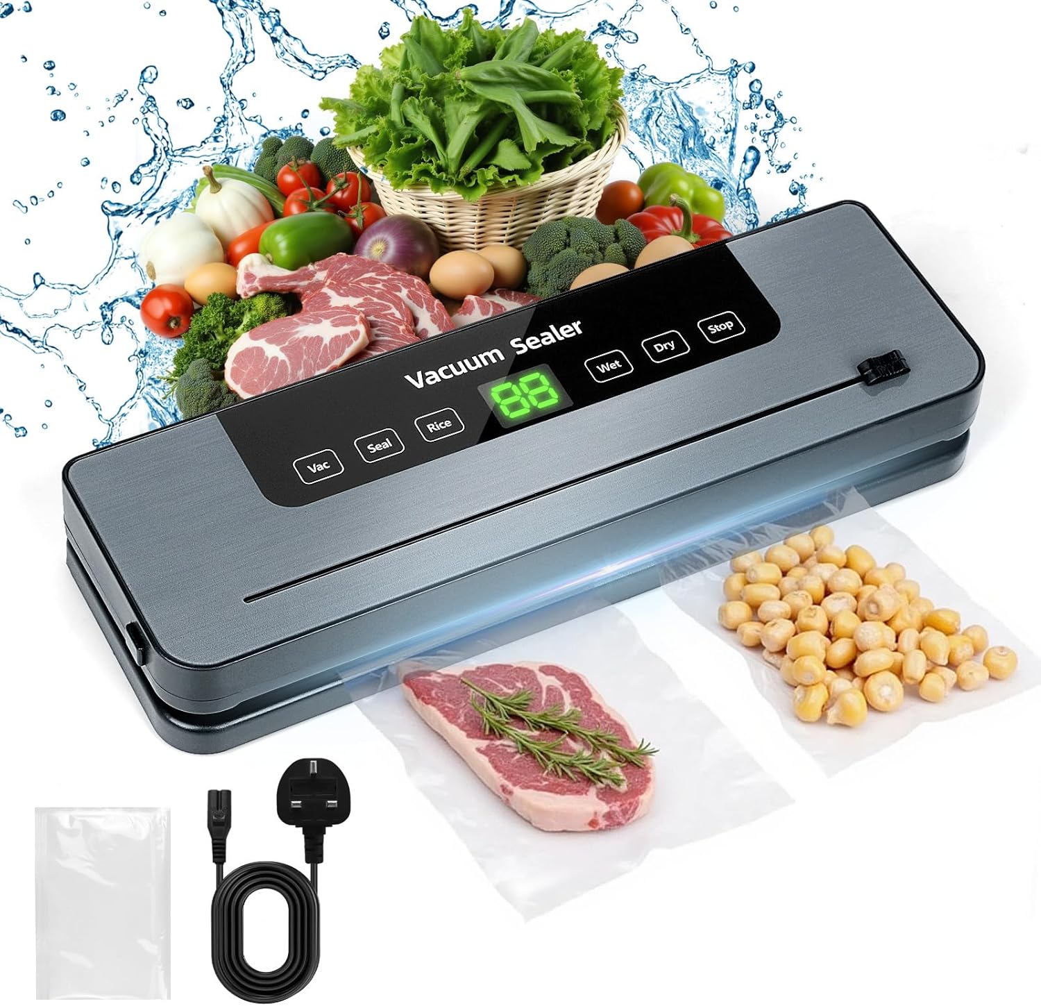 Mfzsyxb Vacuum Sealer Machine, 5-in-1 Full Automatic Food Saver, LED Indicator Lights, Dry/Moist Sealer, Built-in Cutter, 30 Sealing Bags, Stainless Steel, ABS, Grey, Automatic, Sealer
