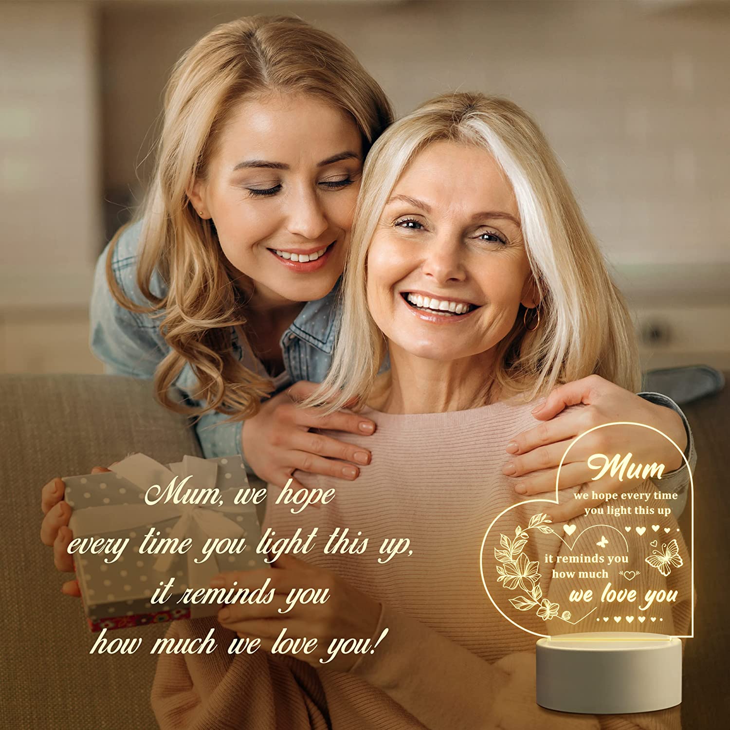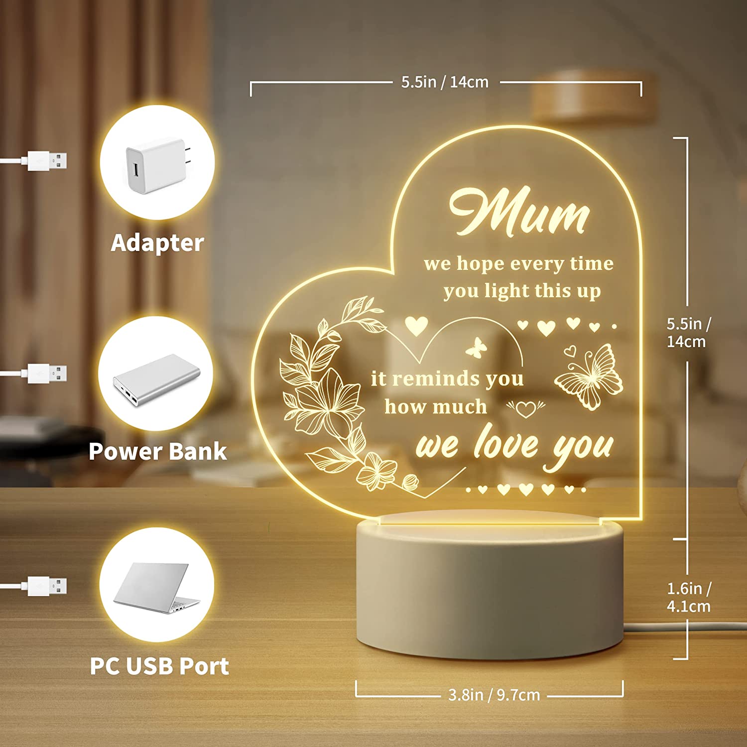 - 【Meaningful Mum Gifts】Engraved with warm saying “Mum, we hope every time you light this up, its reminds you how much we love you.” Make your mum happy and feel your love for her by expressing your true care and love in a particularly romantic way with this meaningful heart night light.