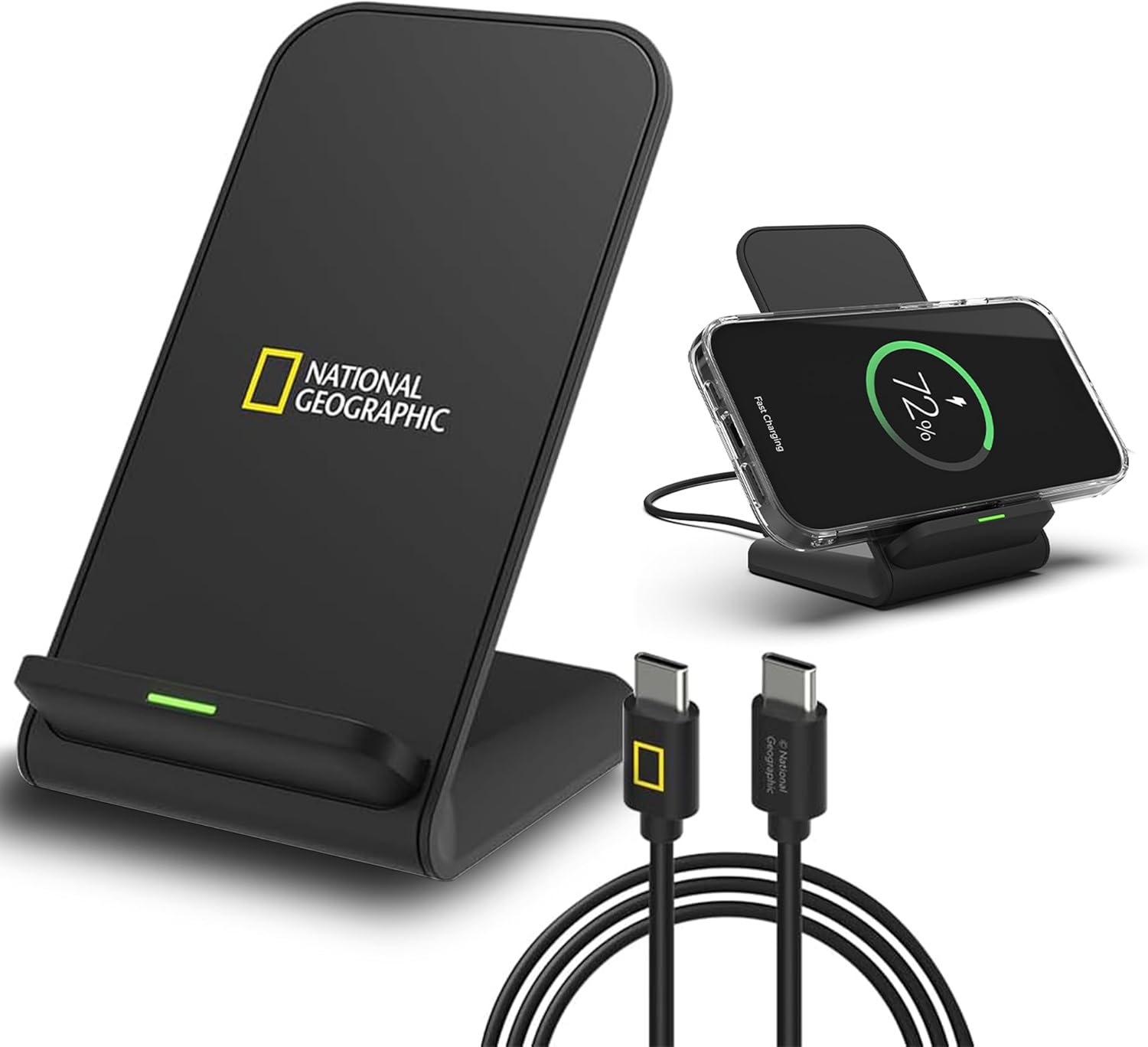 National Geographic Wireless Charger Stand-Slim 15W Fast Charge, Dual Coil, FOD Sensor, Qi Certified For iPhone 16 Pro Max/16 Pro/15/14, Samsung S25/24/S23/S22, Fold 6/5 Quick Charge