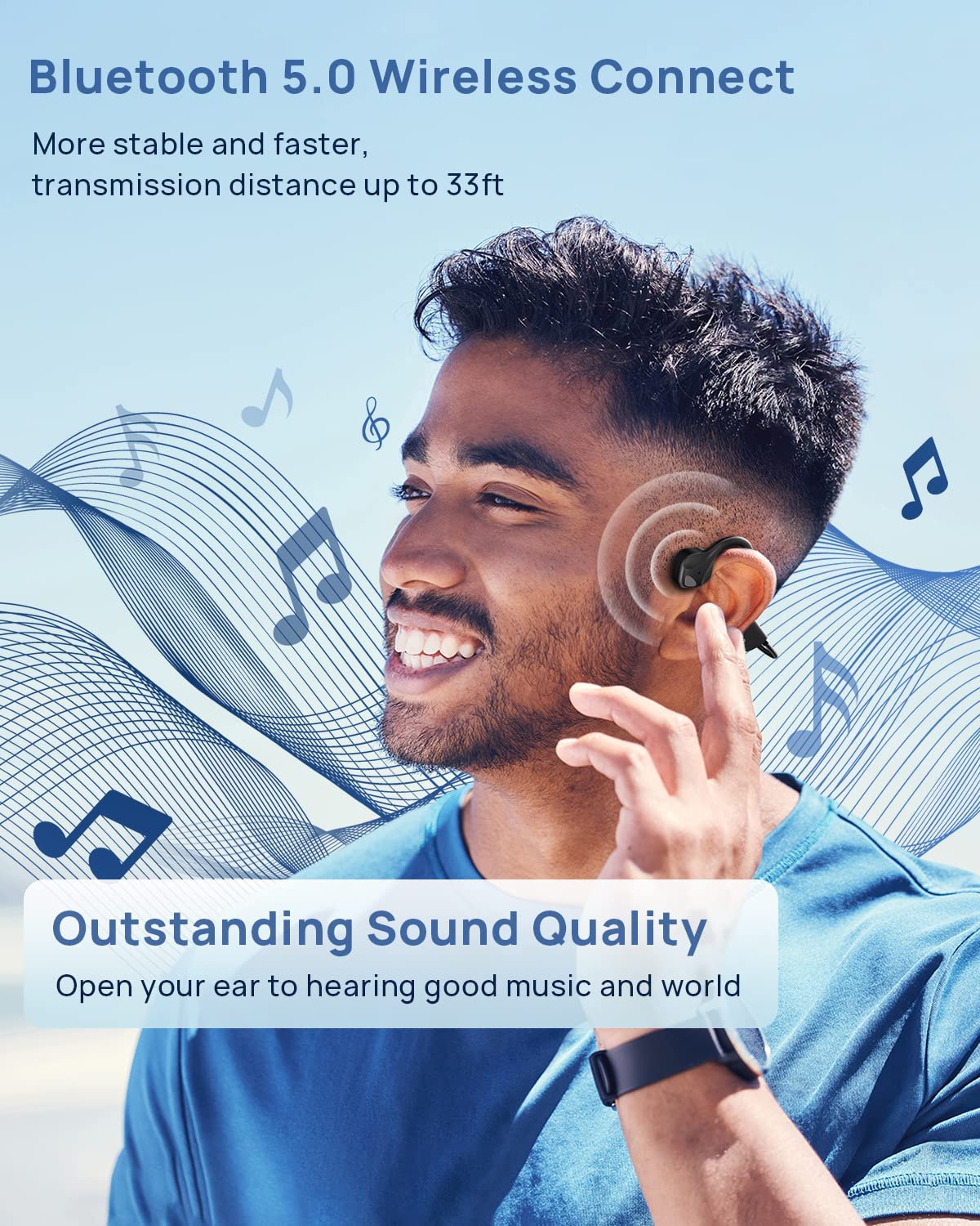 - 【Bluetooth 5.0 Technology】Our open ear headphones with Bluetooth 5.0 technology, more stable and faster wireless connection and up to a range of 33 feets,supports connect any devices with bluetooth function like phones, tablets, laptops,computers, etc.Bluetooth bone conduction headphones with wireless designed free you from cables,not only perfect for indoor outdoor sports as running,cycling,hiking,climbing ect, but also useful for business people who often working,video conferences.