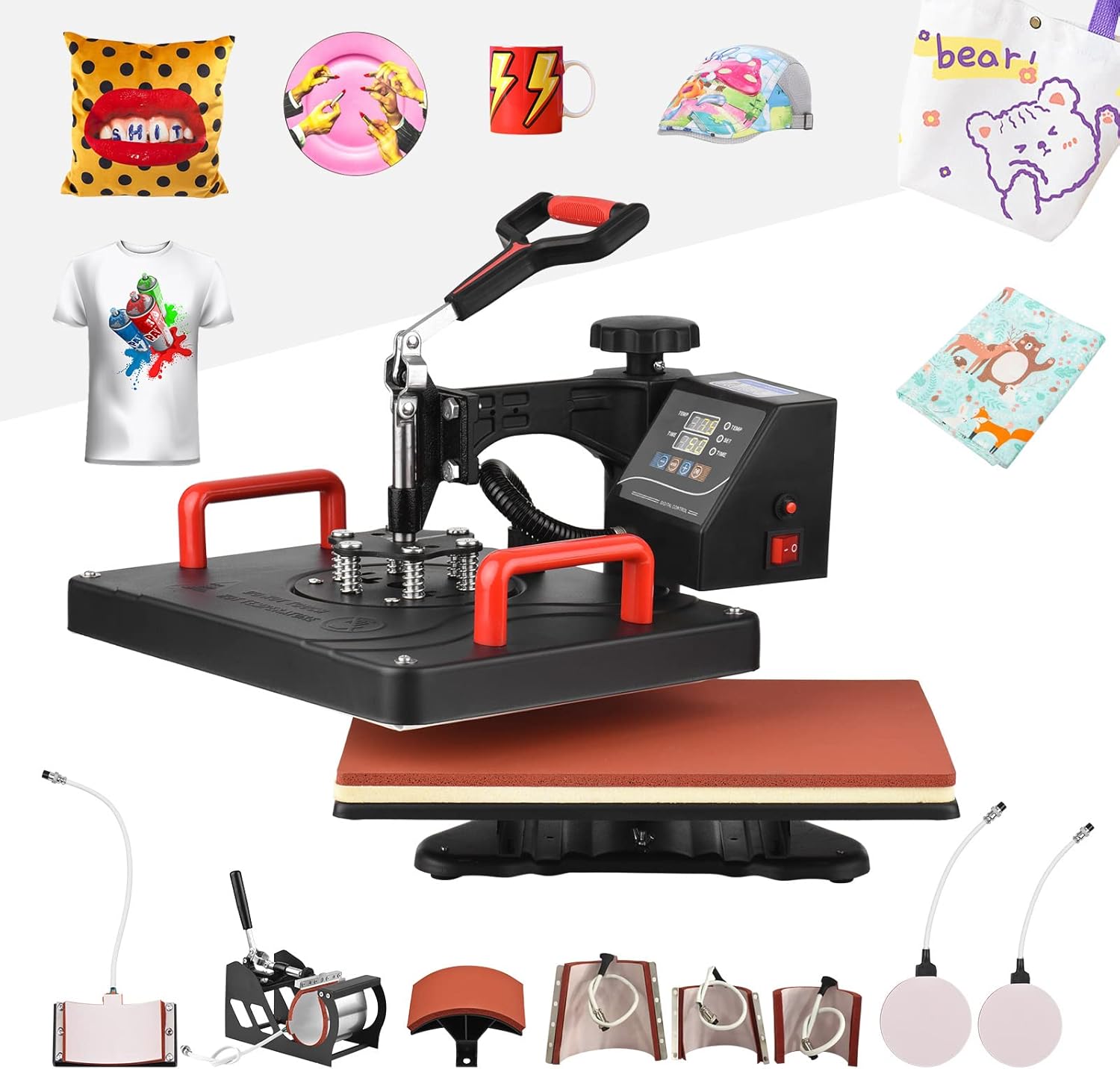 [Wide Application] Equipped with 15.5cm/ 6inch and 12.5cm/ 4.9inch plate presses, hat press, and mug presses, suitable for printing T-shirts, mugs, hats, pillows, mouse pads, bags, and more, satisfying your various DIY needs. [Adjustable Temperature and Time] Fahrenheit and Celsius degree convertible, 0-250℃/ 0-480℉ temperature adjustable, 0-999s time , with display screen for keeping track of temperature and time. [360 Degree Rotatable Design] Convenient for operation, helping direct pressure straight down and apply pressure evenly, improving the qu ty of printed patterns. [Other Details] Large heat transferring area, providing clear and beautiful printing effects; when the preset time is reached, the temperature will maintain constant; iron and aluminum construction, sturdy and durable for long-time use. Specifications: Color: Black Material: Iron + aluminum Product Size: 39 * 33 * 30cm/ 15.3 * 12.9 * 11.8inch Product Weight: 12.46kg/ 27.4lbs Note: The T-shirts, hats, plates, and mugs showed in the pictures are not included. Package List: 1 * Heat Press Machine 2 * Hat Press 4 * Mug Press 2 * Plate Press 5 * Screw 1 * Screwdriver 1 * Wrench 2 * Replacement Part 1 * Plug 1 * Pair of Gloves