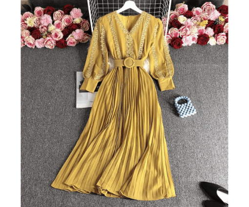 Pleated Classic Dress with Belt, Free size | Yellow Mustard