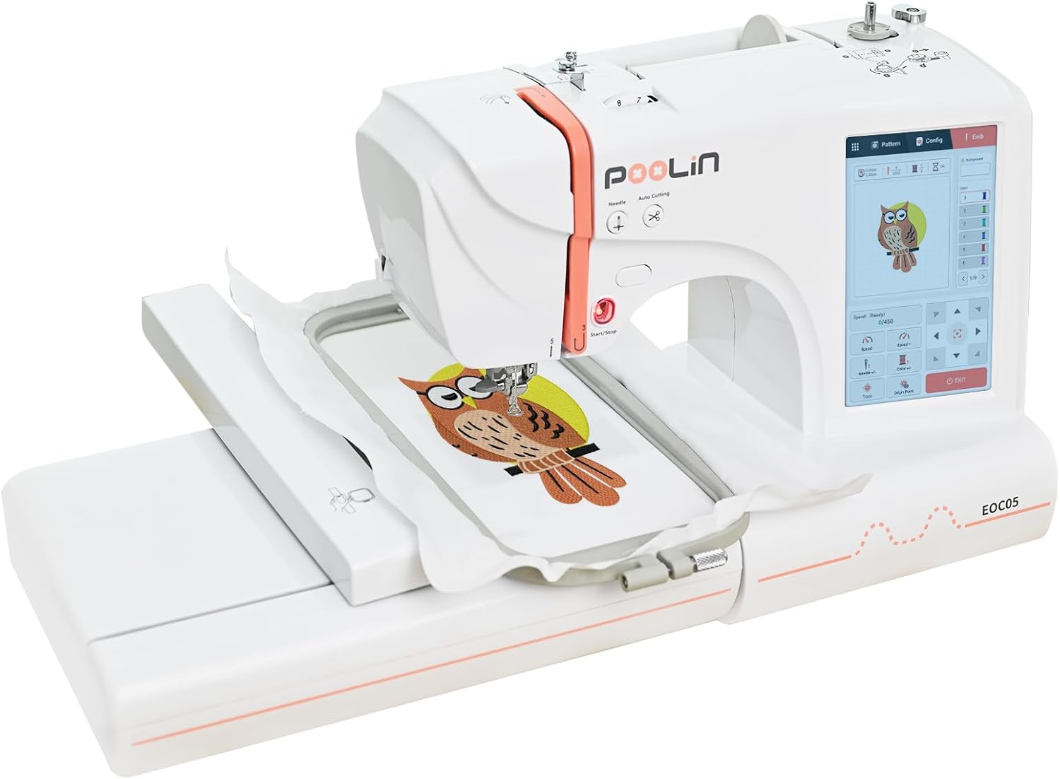 POOLIN EOC05 Embroidery Machine 10×23.5 cm Large Embroidery Area, Computerized 7 Inch Large LCD Touchscreen for Beginners, Include Thread Stabilizer Bobbins USB Hoops