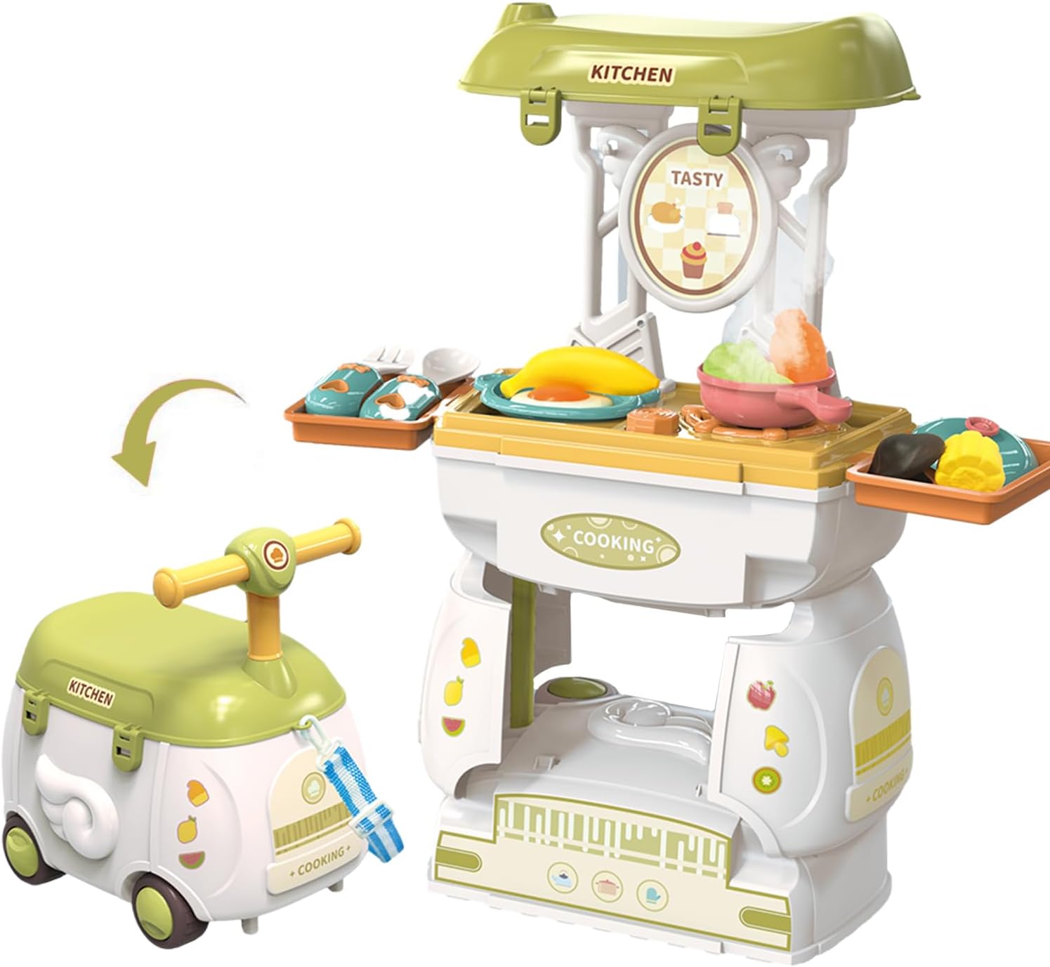Pretend Play Kitchen Toy,2-in-1 Kids Storage Cart Transforms into a Play Kitchen, Kids Kitchen Playset with 26 Play Food Toys, Toy Kitchen Accessories with Real Sounds for Toddlers, Girls and Boys.