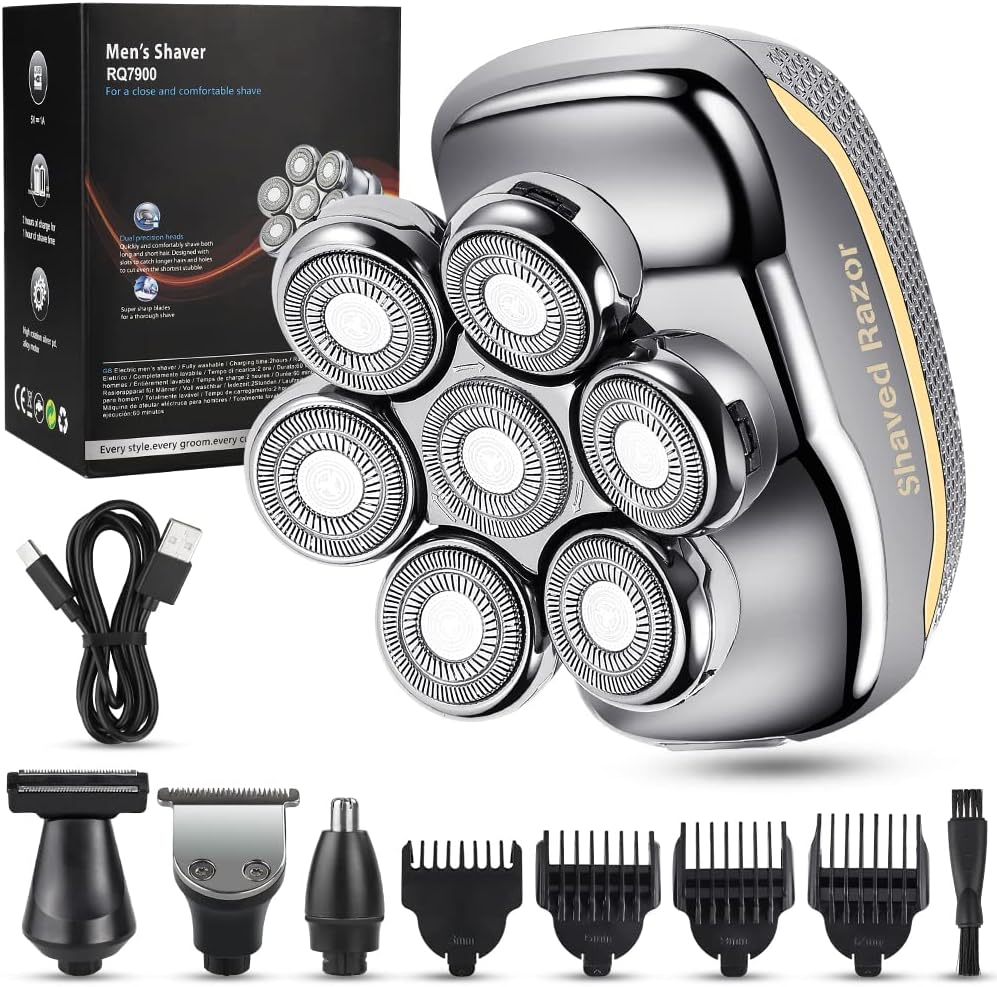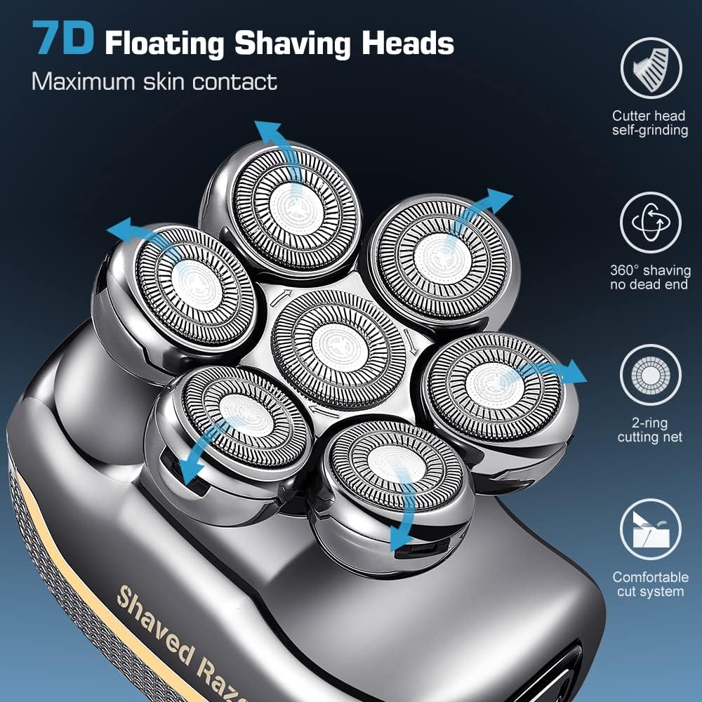 Upgraded 7D Floating Shaving Head:The upgraded version of the 7D floating shaving system is ergonomically designed.The design of 7 cutter heads increases the shaving area and saves shaving time.Not only a men’s bald shaver, but also a hair clipper, a body shaver, a nose/ear hair clipper, a 4-border comb (3/6/9/12mm), A large number of accessories can meet any of your shaving, beauty and cleaning needs, suitable for home and travel, and convenient for your life.