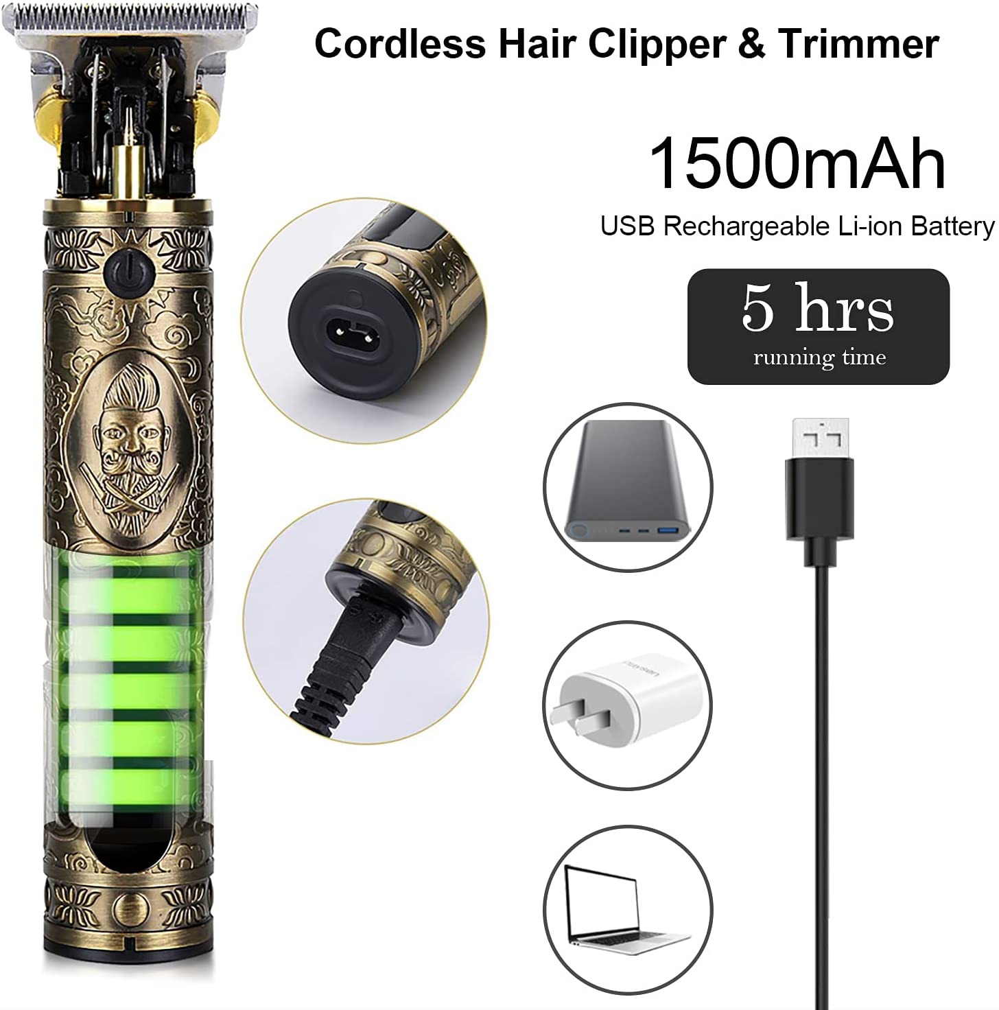 - LED DISPLAY & RECHARGEABLE LI ION BATTARY This cordless hair clipper is built with LED Display and 1500MAh Li ion battery to be fully charged in about 2.5 hours and can be used for about 5 hours. Designed With rechargeable USB wires, this professional hair clippers can be recharged via connection to USB adapter, laptop, car charger, power bank etc. The LED Display shows the available power, warning for low battery, and the charging indicator light.