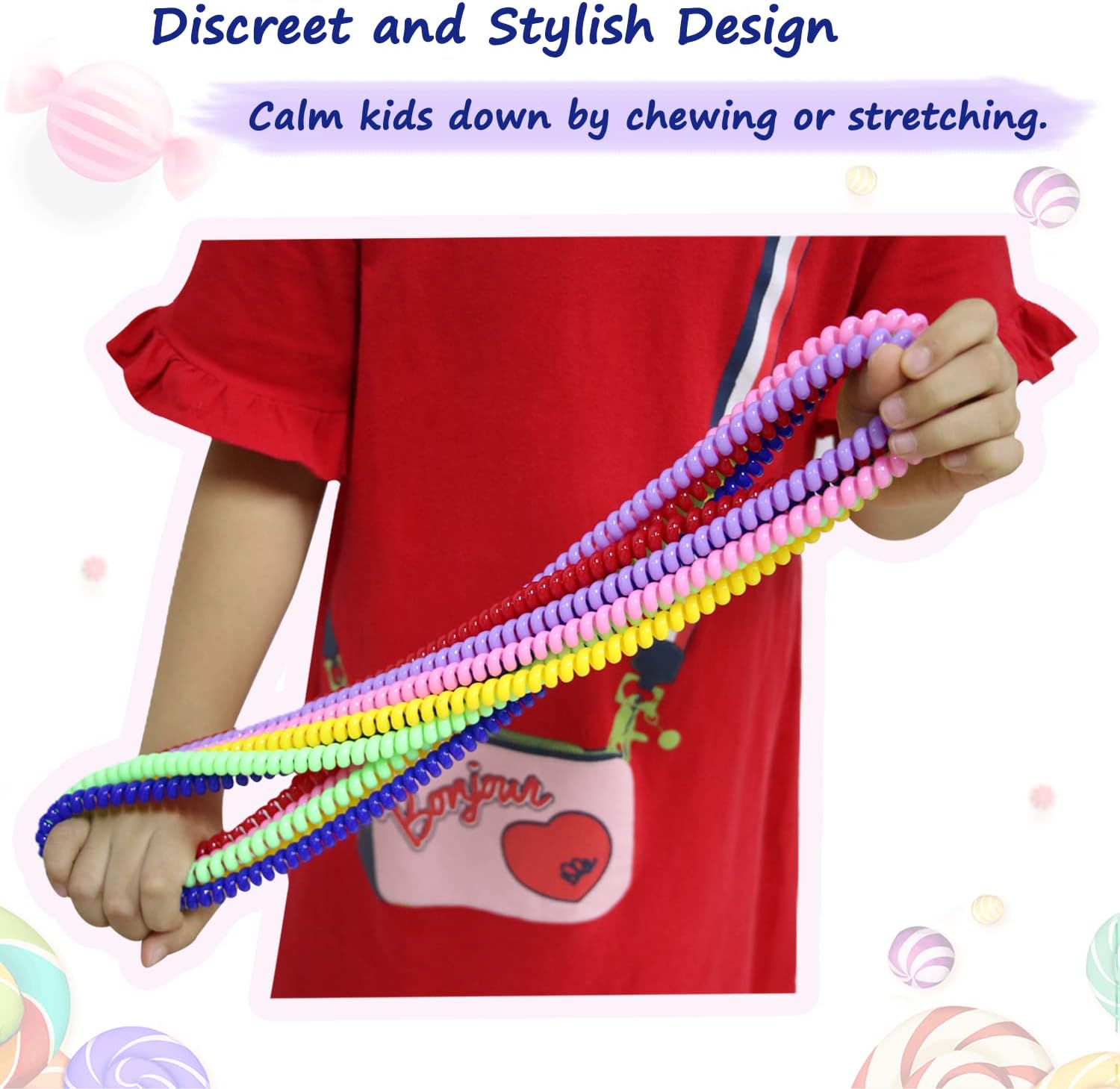 – Our sensory stretch chew necklace with beautiful colors and special function, boys and girls will be immediately attracted. Perfect style and size good for grab and play.