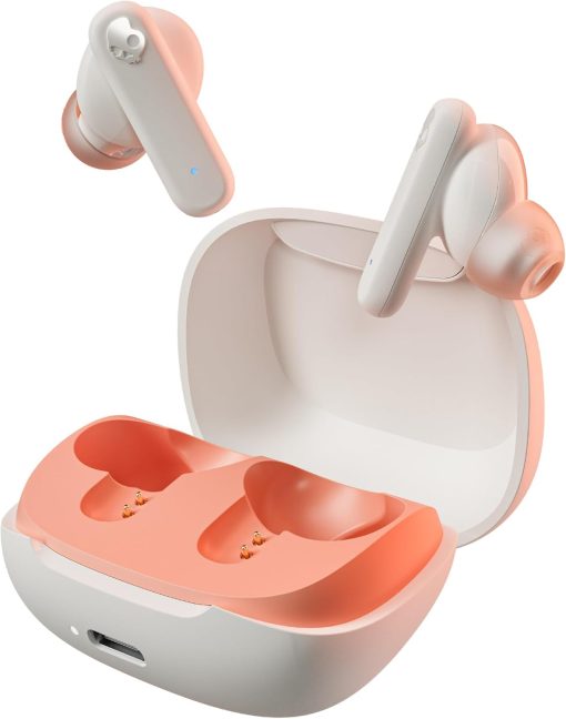 Skullcandy Smokin’ Buds Wireless In-Ear Headphones, 20 Hours of Autonomy, 50% Renewable Plastics, Microphone, Compatible with iPhone Android and Bluetooth Devices – Bone/Orange Glow