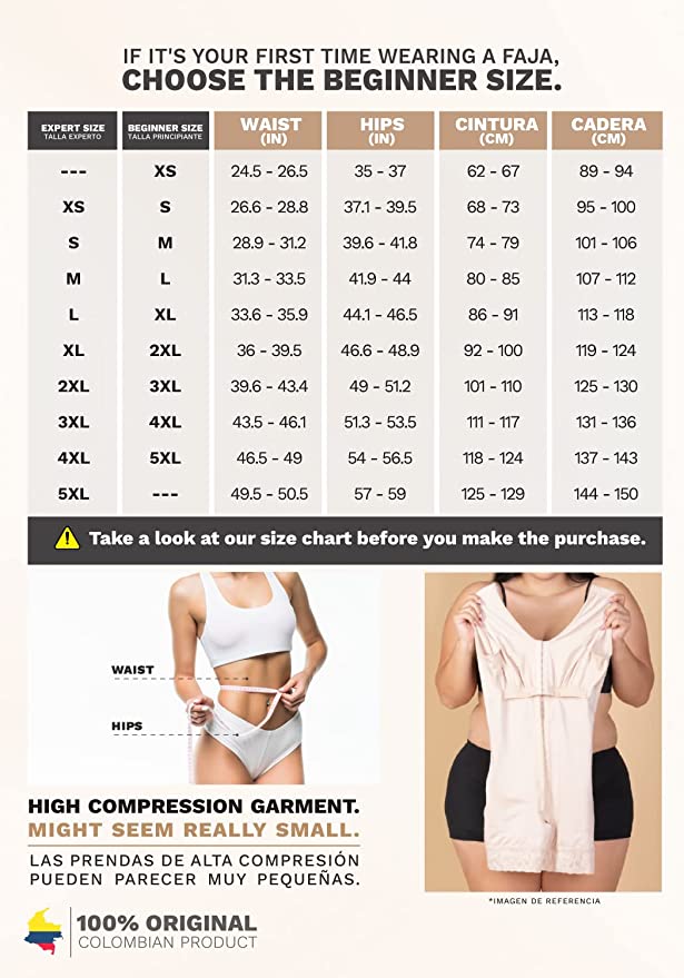 - CHECK SIZE CHART BEFORE THE PURCHASE: Fajas’ sizes are different from usual clothes, always measure your waist and hips to find your size. Hips measures for BEGINNERS: XS (35-37″), S (37.1-39.5″), M (39.6-41.8″), L (41.9-44″), XL (44.1-46.5″), 2XL (46.6-48.9″), 3XL (49-51.2″), 4XL (51.3-53.5″) If you are a regular faja user, find your size in the column EXPERT. It will seem smaller than it really is, STRETCH IT! We have great videos with NOT SO OBVIOUS TIPS (visit our Store to find them)