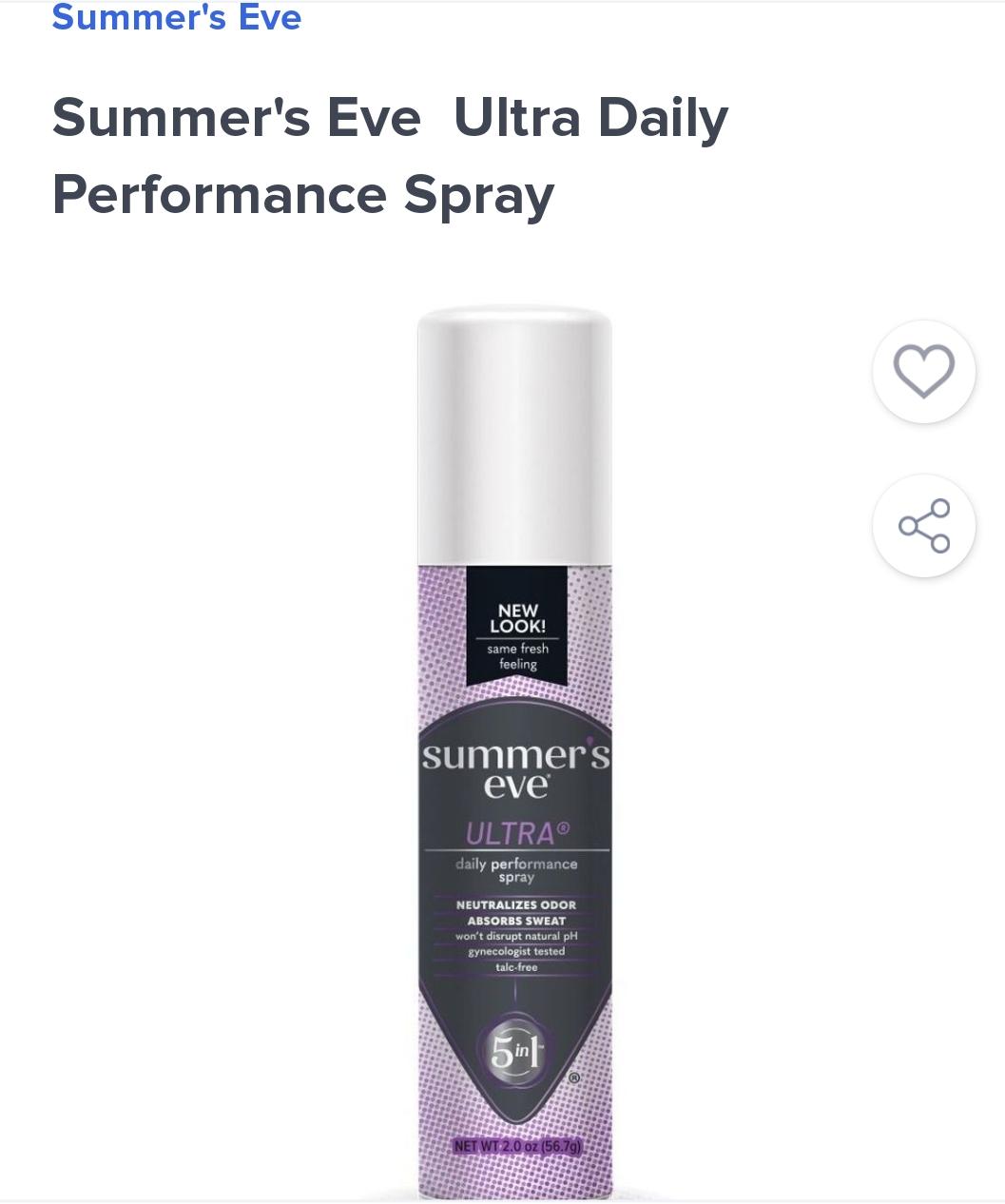 OverviewExperience a freshness that helps you feel ready every day. Summer’s Eve® Ultra® spray is perfect for whenever you need an extra boost of freshness. Won’t disrupt your body’s natural pH, and specialized for your active lifestyle. Use daily, or as a quick refresher. Shake well, remove cap. Hold can at least 8 inches away and spray external vaginal area. For extra freshness, spray panties and feminine liners. Repeat as needed to feel shower-fresh all day long