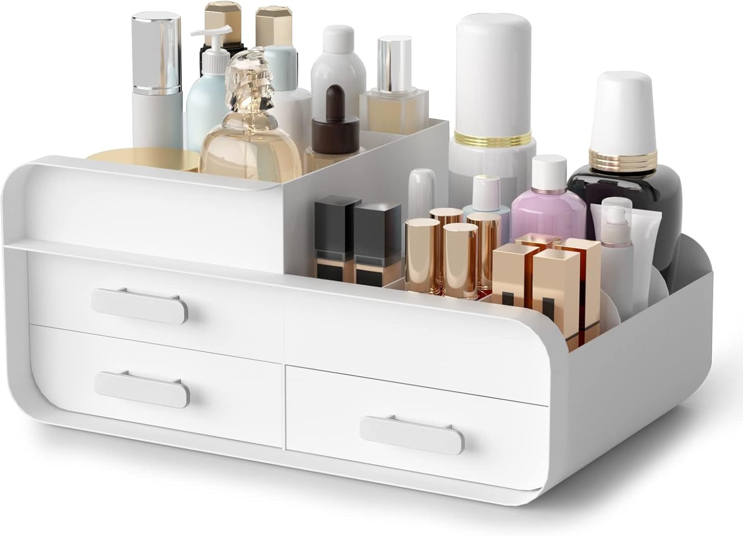 Our makeup organizer is its sleek and stylish design. The rounded curves and smooth lines add a touch of sophistication to any bathroom, bedroom, or dressing room.