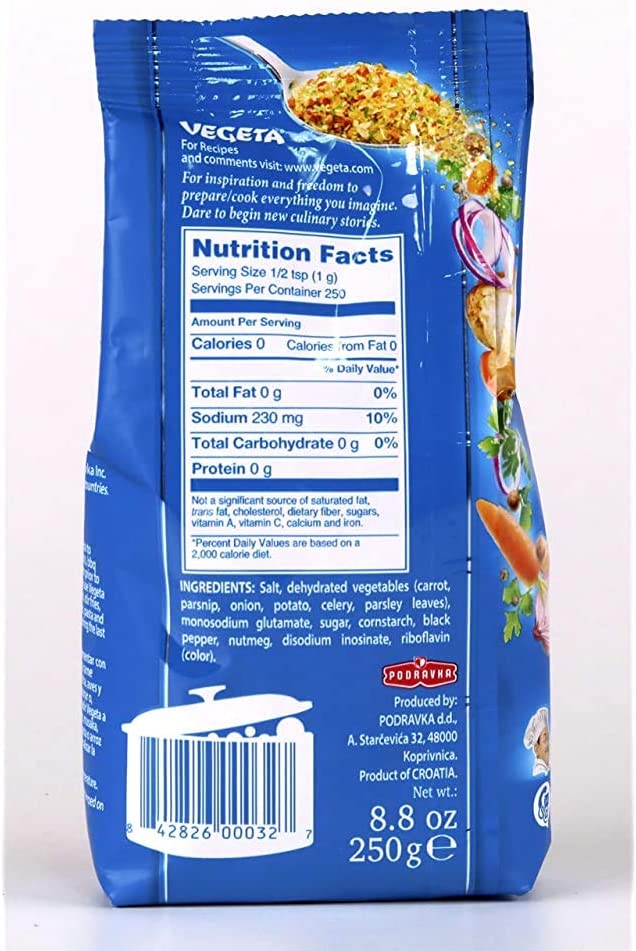 INGREDIENTS: Salt, dehydrated vegetables (carrot, parsnip, onion, potato, celery, parsley leaves), monosodium glutamate, sugar, cornstarch, black pepper, nutmeg, disodium inosinate, riboflavin (color).