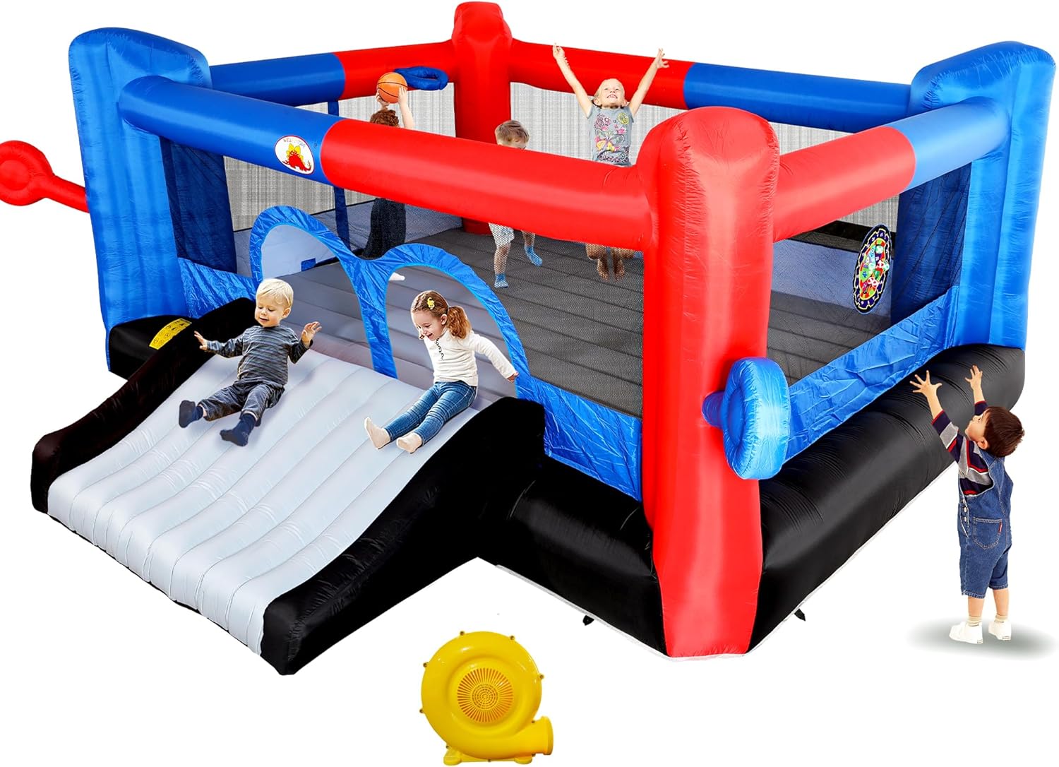 WELLFUNTIME Inflatable Bounce House with Slide, Jumping Castle with Blower, Dartboard, Dual Basketball Hoop, Dual Kicking Boards, Jumping Area for 6 Kids Bouncy House with Slide