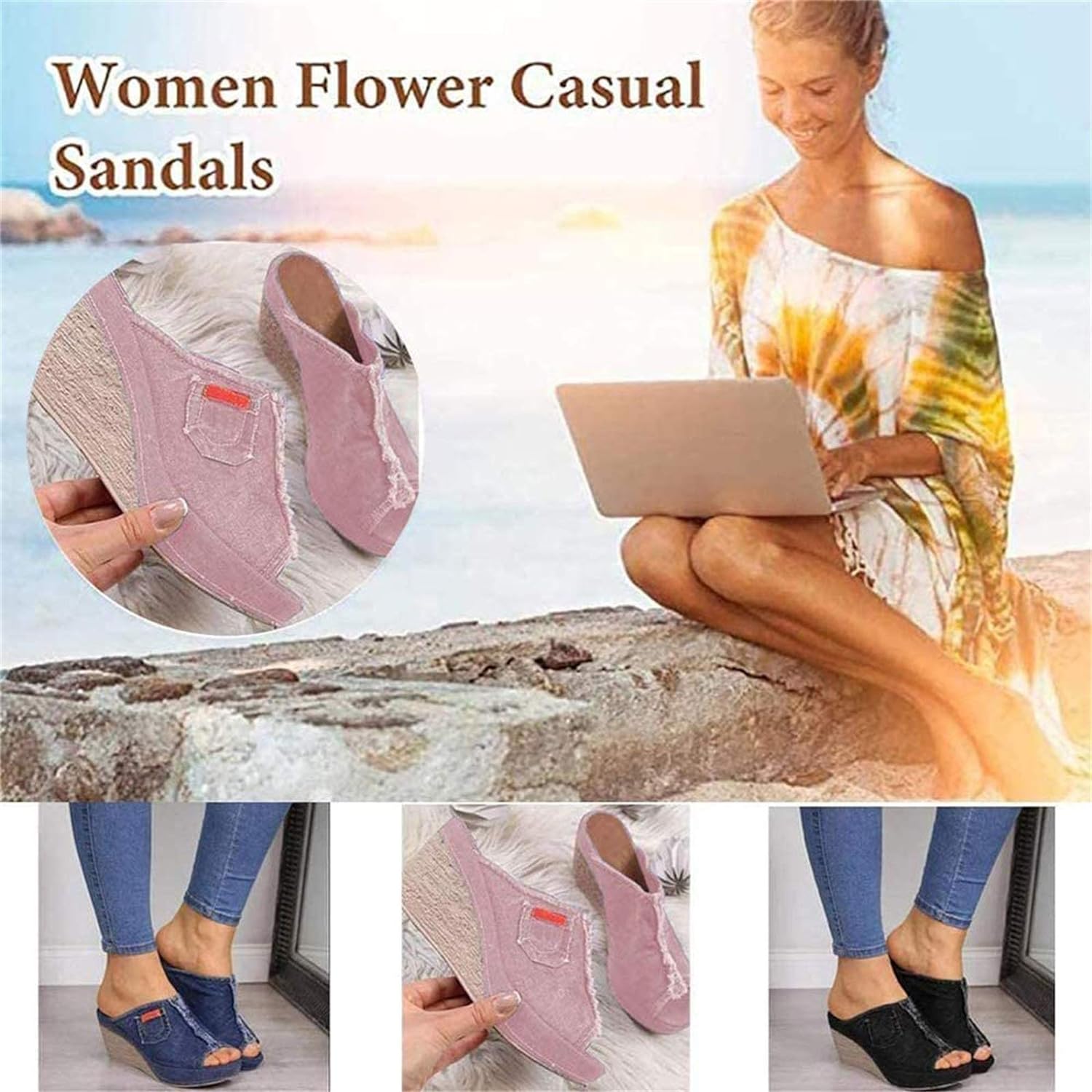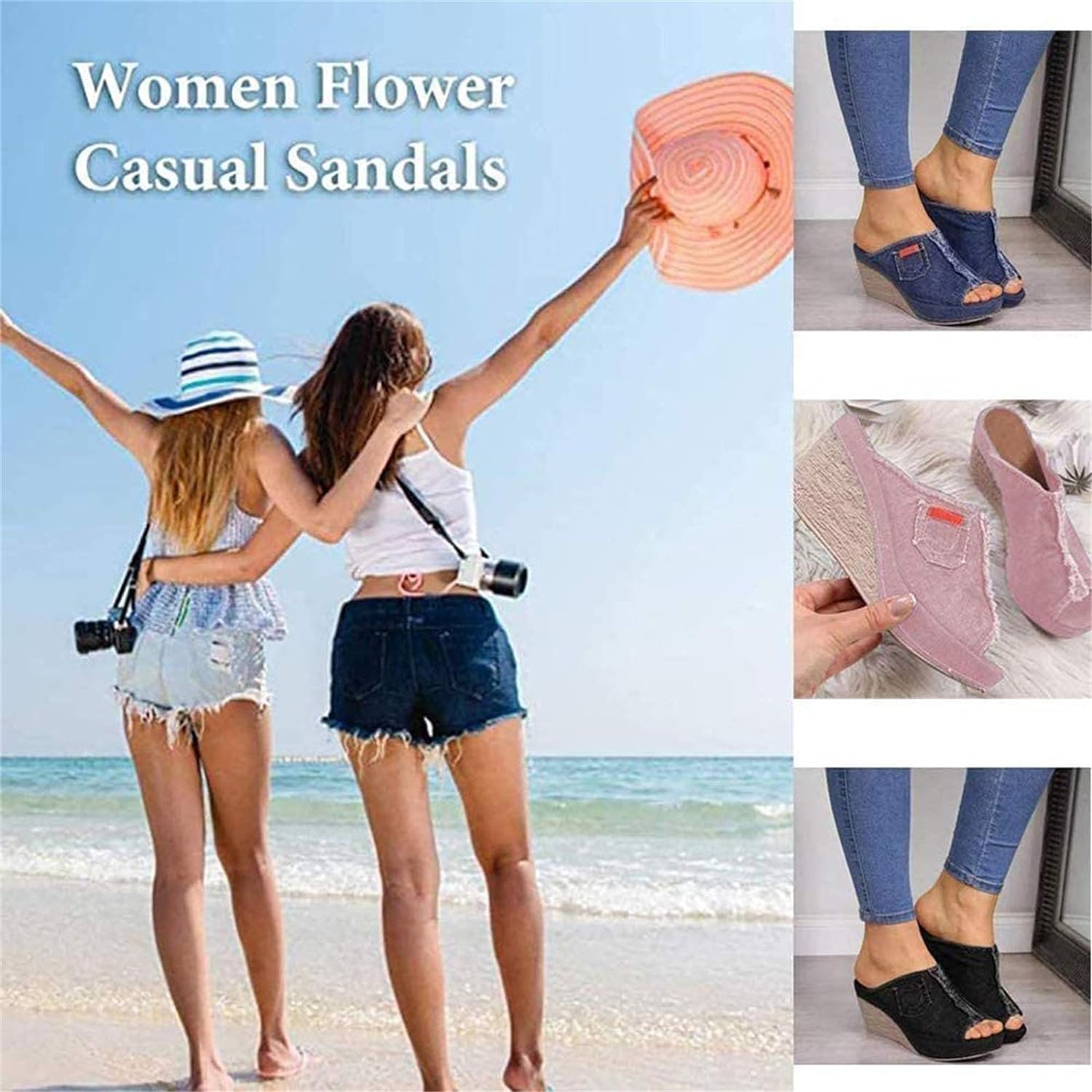 ZJYZJQ Platform Sandals Mules Wedge Heel Retro Denim Canvas Sandals Women Open Toe Fish Mouth Slides Beach Travel Shoes